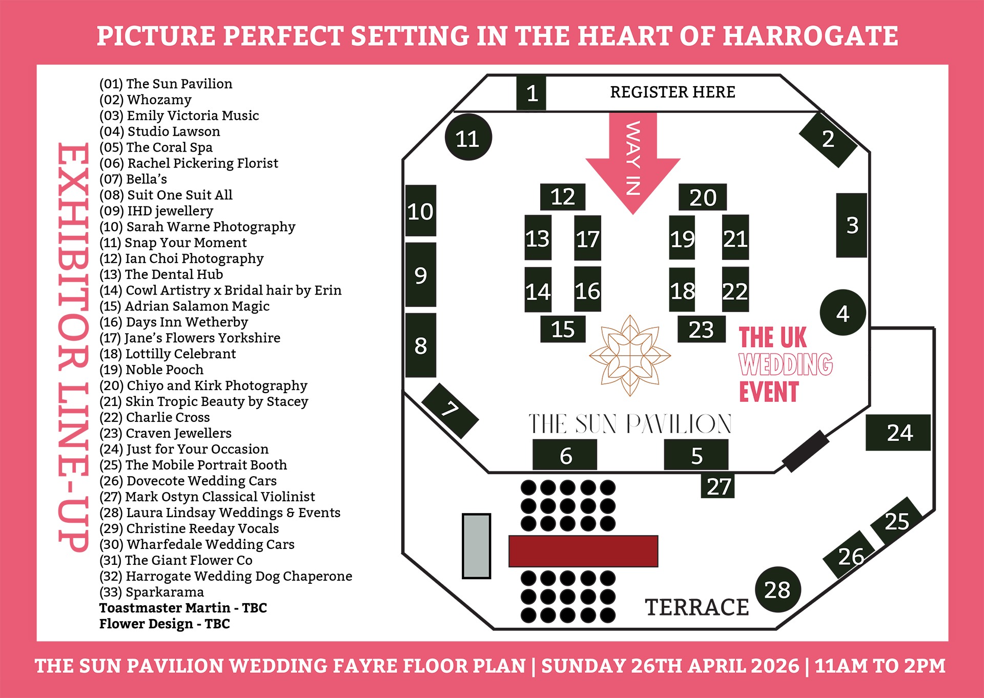 The Sun Pavilion websiteThe following wedding suppliers are all booked in to exhibit at our second wedding fayre of 2026 at The Sun Pavilion in Harrogate on Sunday 27th September. Get in touch if you would like to join the line-up.